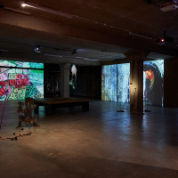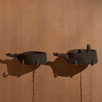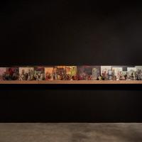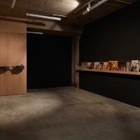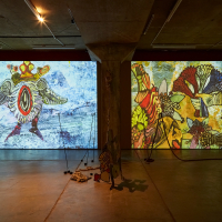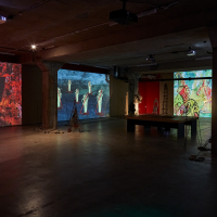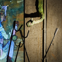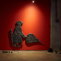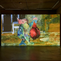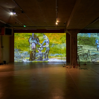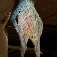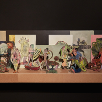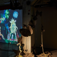 Jackson’s work in the exhibition, advances a conversation that has been quietly playing out in the field of academia and medieval studies. In her installation, the viewer is invited to wander amongst larger than life projected animations, cut-out figures and body bits, handmade clay objects, drawings and more. Jackson has rallied together a procession of pilgrims, a carnival of conceptual nomads that jostle and jive, fight, fuck and take flight across a trans-historical plane of existence, of which we are as much participants as voyeurs.